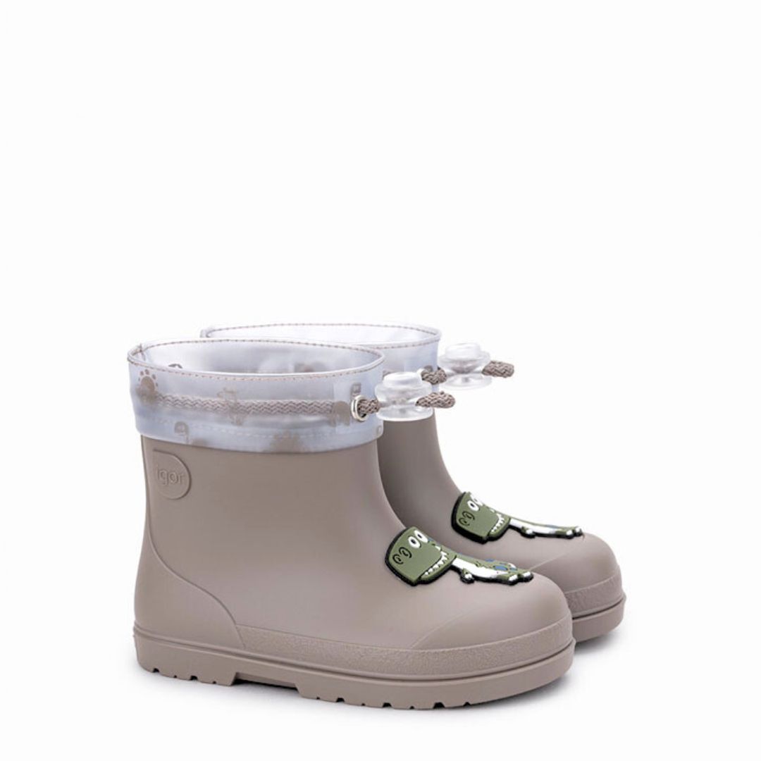 Botas de agua respetuosas de la marca Igor, modelo Mendi Dino taupe. Tallas de la 22 a la 28.