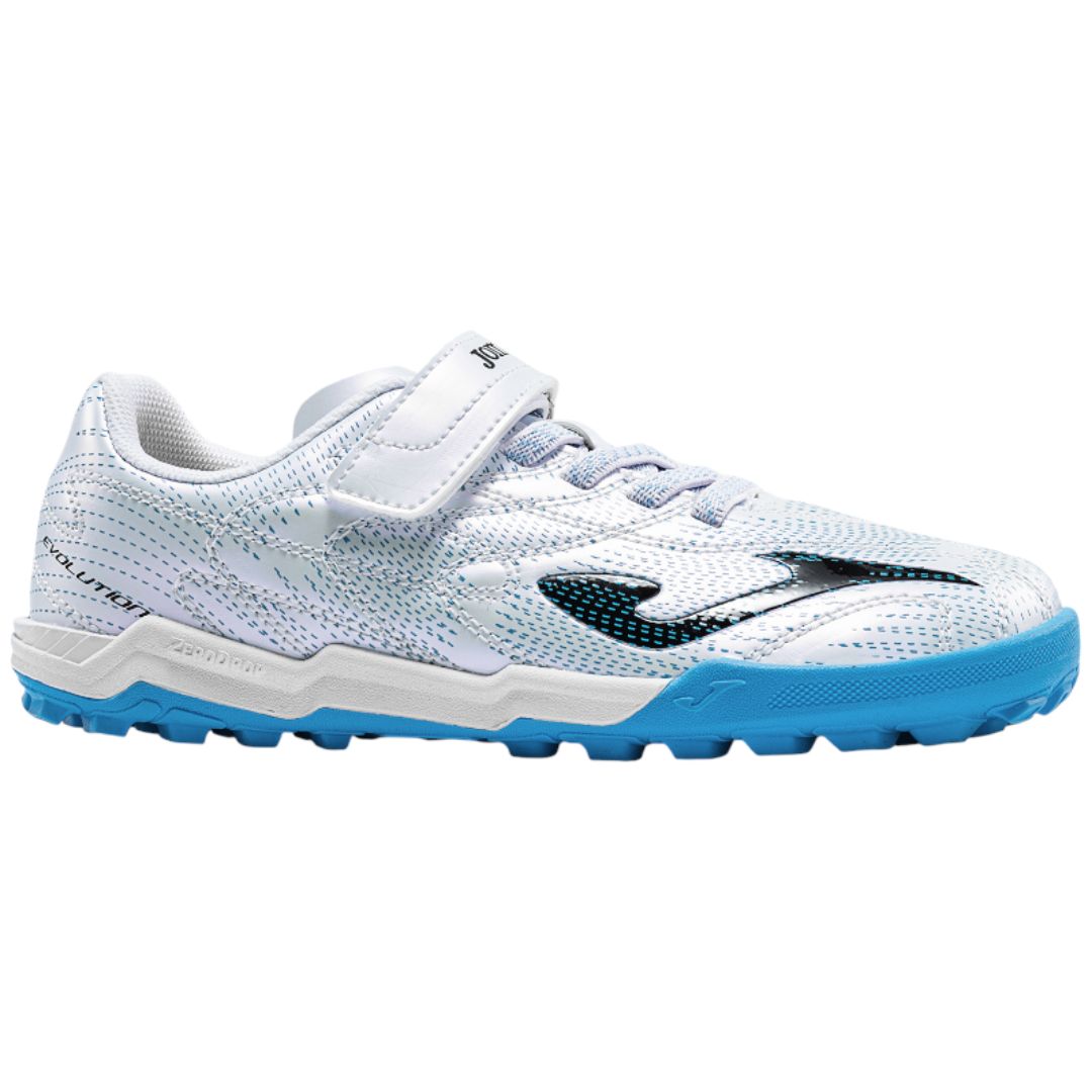 Calzado respetuoso botas de fútbol de la marca Joma, modelo Evolution Barefoot 2532 White Turf en color blanco metalizado con detalles en azul, plantilla extraíble.  Suela sin drop, plantilla extraíble sin elementos anatómicos que interfieran, contrafuerte prácticamente inexistente. Ajuste mediante velcros lo cual favorece la autonomía de los más peques, elástico en el empeine.