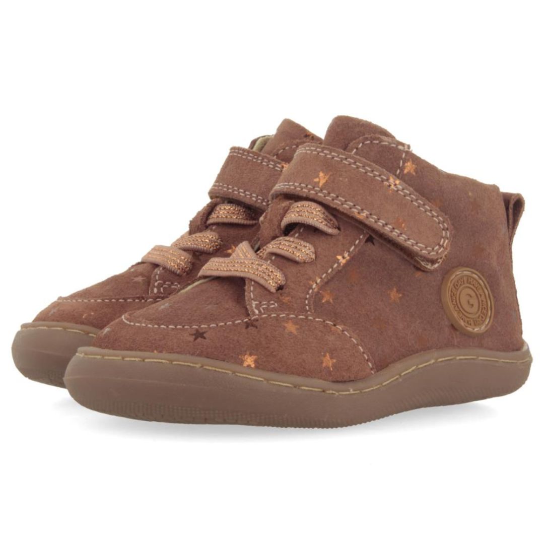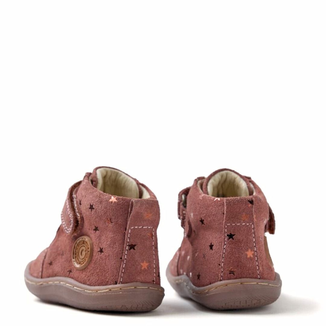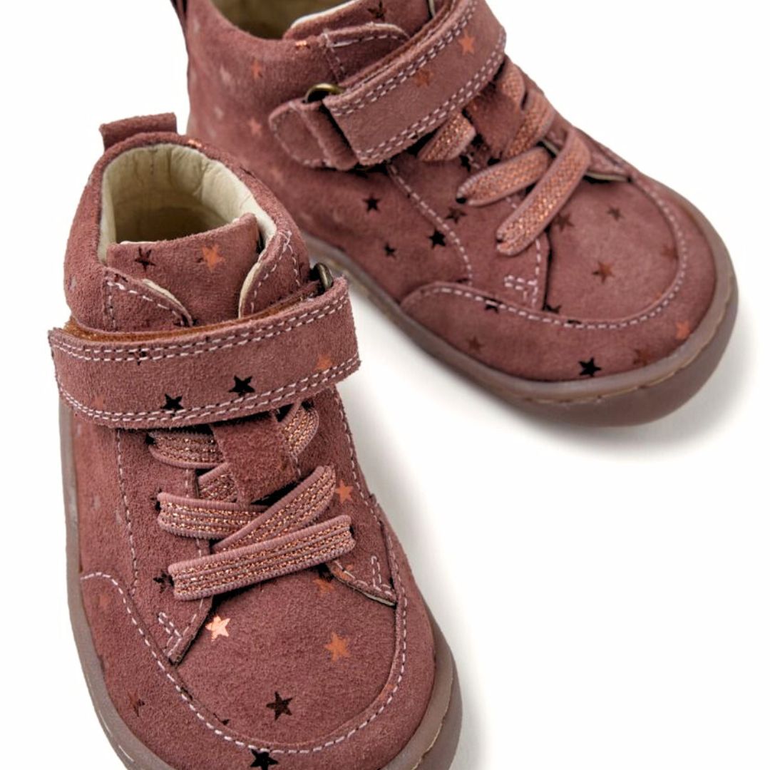 Botitas respetuosas de la marca Gioseppo, modelo Frazee Pink. Fabricados en piel serraje, con estampado de estrellas metalicas. Calzado respetuoso flexibles, drop cero, plantilla sin elementos anatómicos que interfieran contrafuerte prácticamente inexistente. Sin refuerzos que ferulicen. Ajuste mediante velcro y elástico al empeine. Estampado de estrellas metalizadas.