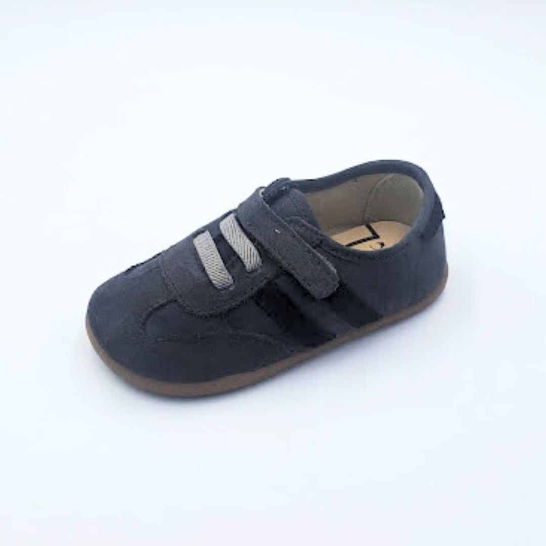Calzado respetuoso de la marca Batilas, modelo X93/030/050 en color gris con flanjas laterales y trasera en color negro. Fabricadas en piel combinadas con textil. Suela sin drop, plantilla extraíble sin elementos anatómicos que interfieran, contrafuerte prácticamente inexistente. Ajuste mediante velcro y elástico en el empeine lo cual favorece la autonomía de los más peques.