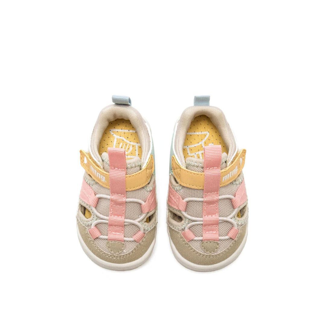 Sandalias barefoot de la marca Mustang, modelo 48908 en color beige con detalles en rosa y verde agua, ideales para la guardería, súper combinables, puntera elevada que sirve como refuerzo.