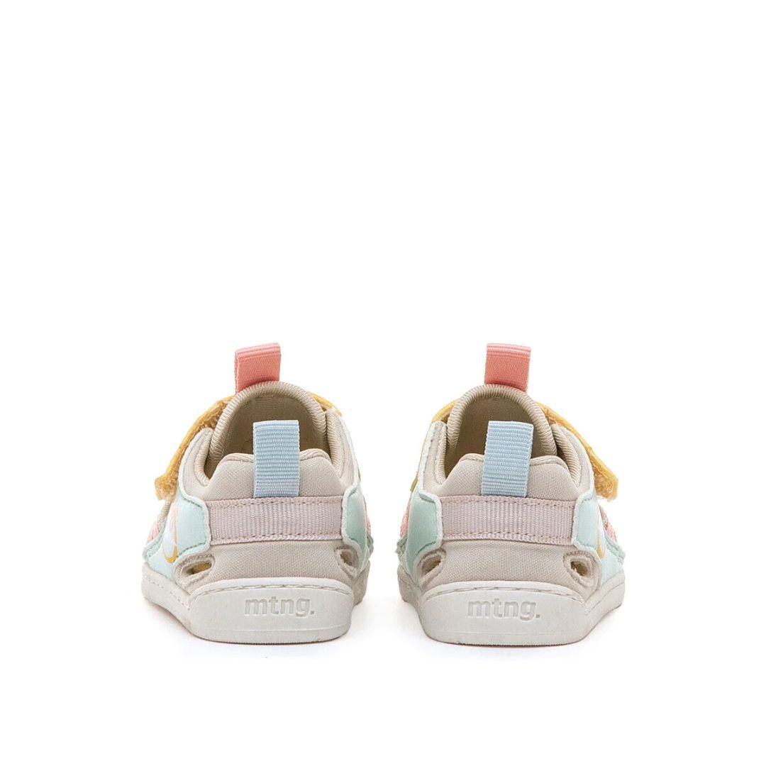 Calzado respetuoso, sandalias en lona de la marca Mustang, modelo 48908 en color beige con detalles en rosa y verde agua. Tallas de la 19 a la 26