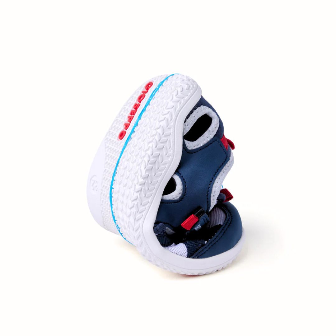 Sandalias respetuosas de la marca Gioseppo, modelo Calabar en color marino con detalles en gris y en rojo. Sandalias tipo cangrejeras con rejilla. Calzado respetuoso flexibles, drop cero, plantilla extraíble sin elementos anatómicos que interfieran, contrafuerte prácticamente inexistente ajuste mediante velcro. Calzado muy recomendable para los campamentos de verano.