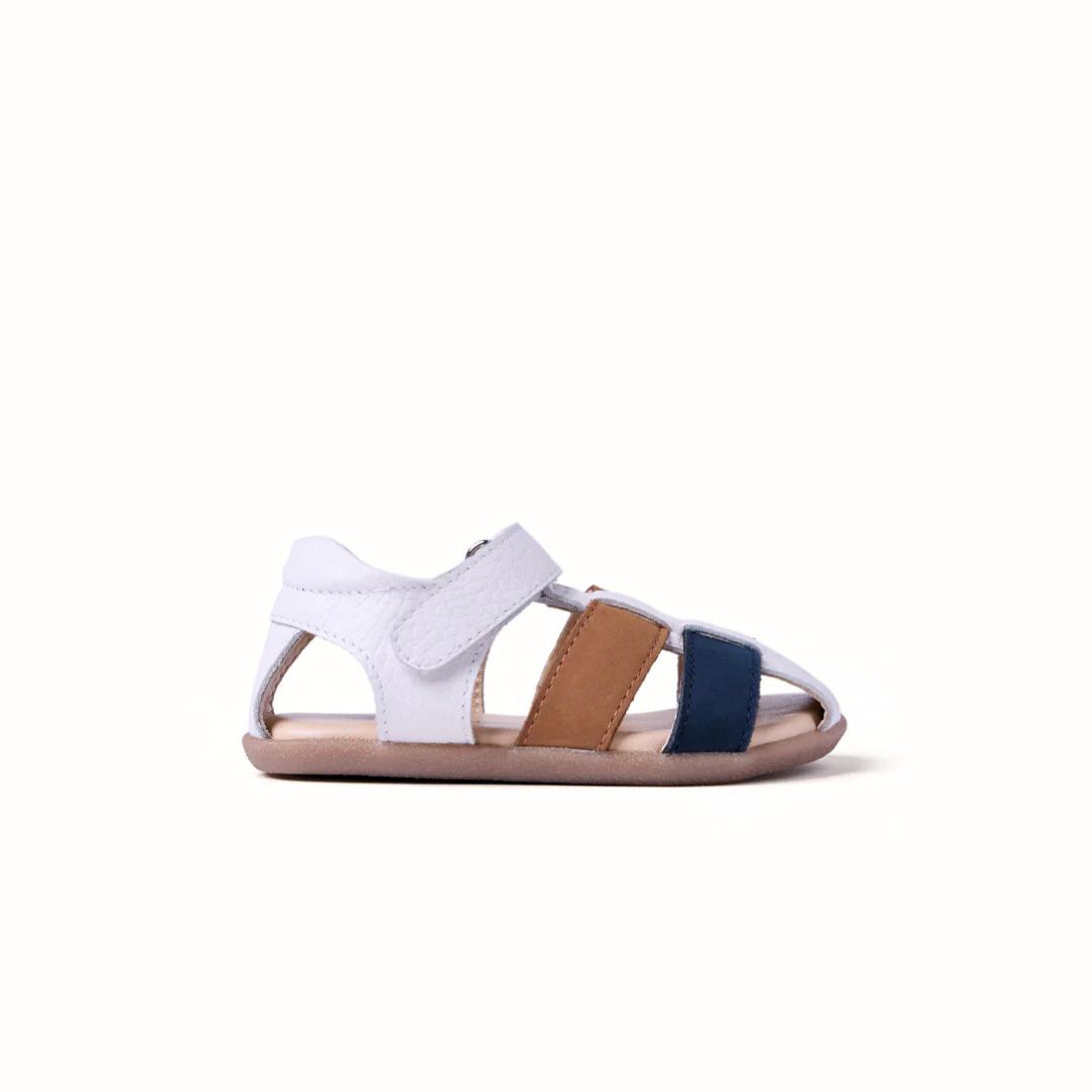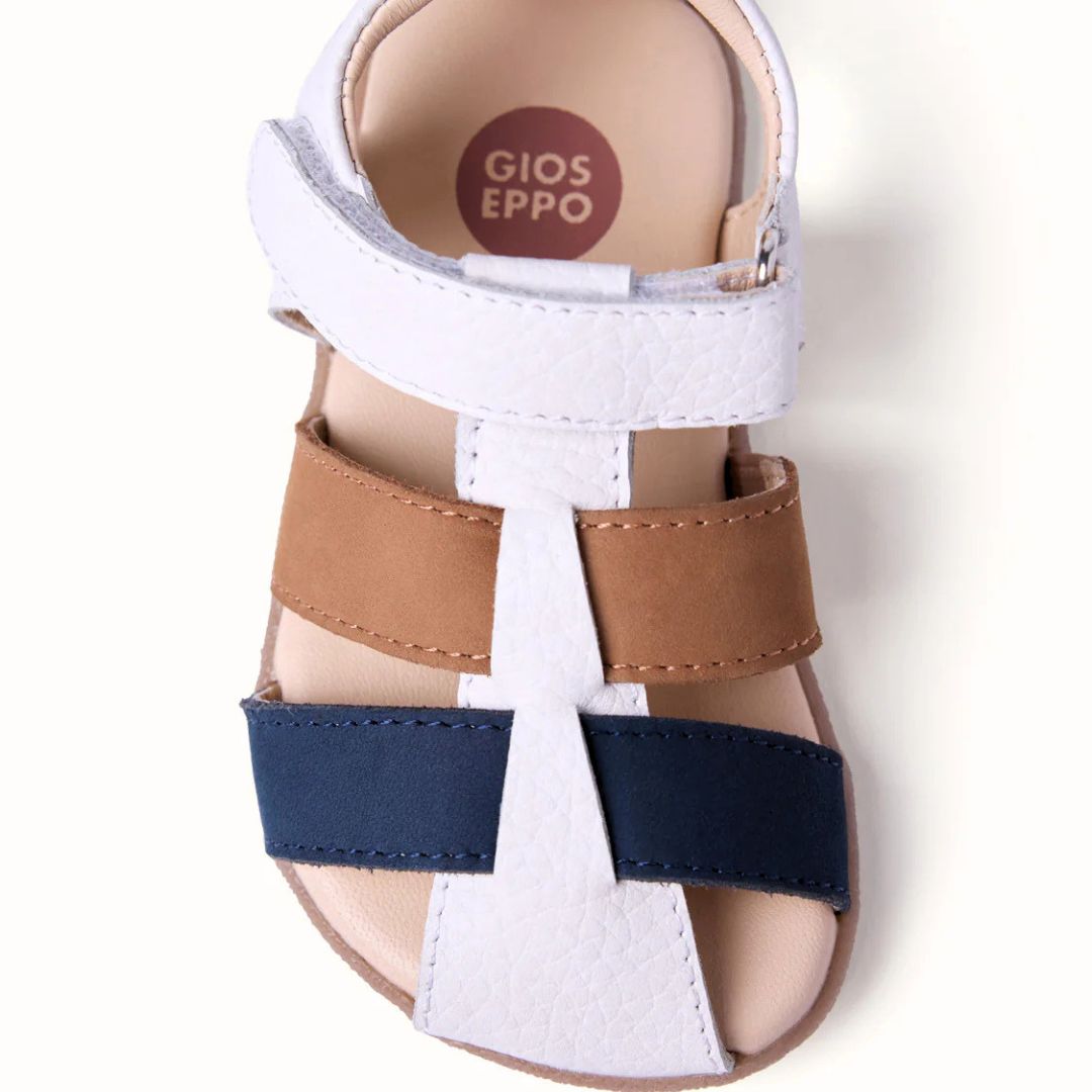 Sandalias respetuosas de la marca Gioseppo, modelo Morley Blanco con tiras en color cuero y en marino. Fabricados en piel. Calzado respetuoso flexibles, drop cero, plantilla sin elementos anatómicos que interfieran contrafuerte prácticamente inexistente. Sin refuerzos que ferulicen. Ajuste mediante velcro.