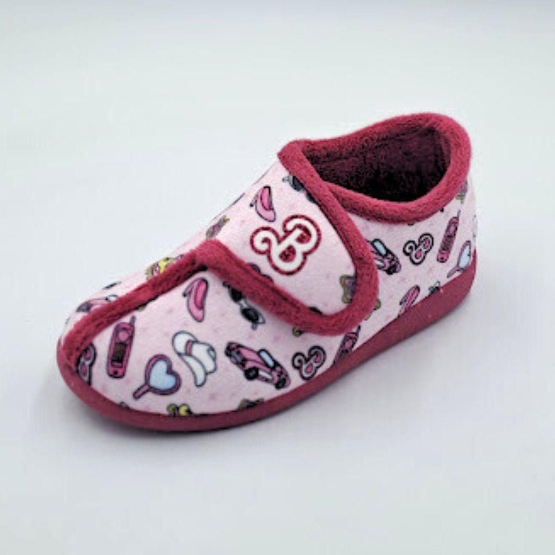 Zapatillas de estar en casa de la marca Garzón, modelo N4305.246 frambuesa, con estampados con detalles de Barbie. Muy calentitas. Fabricación en España en material textil. Ajuste mediante velcro para mayor autonomía de los peques.