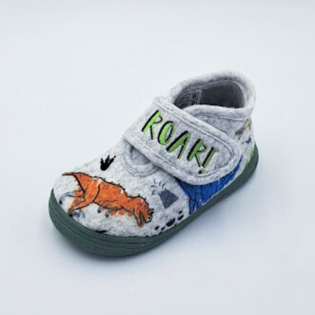 Zapatillas de estar por casa respetuosas de la marca Zapy, modelo AK313960 Dinosaurio gris. Calzado respetuoso flexibles, drop cero, plantilla extraíble sin elementos anatómicos que interfieran contrafuerte prácticamente inexistente ajuste con velcro. Fabricados en España.